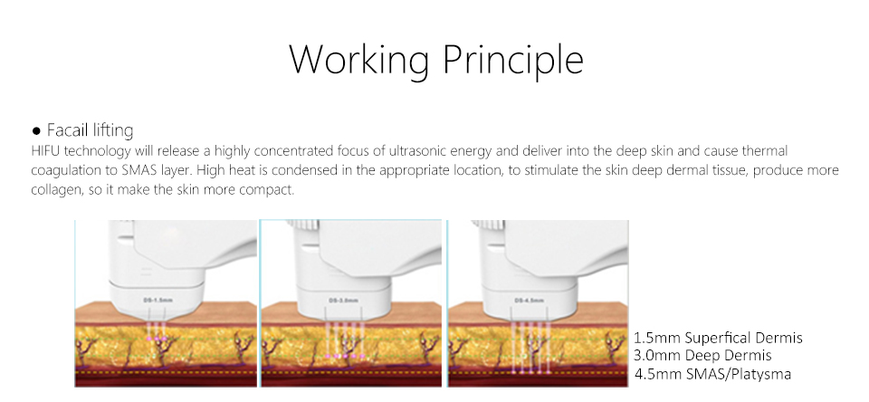 Use high energy ultrasound focusing the treatment position, so that the skin tissue creates thermal, and make high-speed friction cells to stimulate collagen. Such heat effect will not hurt the epidermis, because the treatment fast and direct access to the treatment site within 0-0.5 seconds, without touching the surrounding tissue and can be passed directly to the superficial tendon membrane system (SMAS), so it can be done firm skin while pulling the muscle layer, thin face up to the progressive effect.