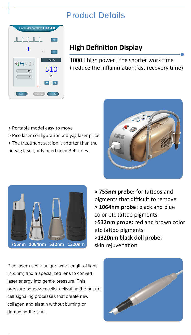 Pico laser uses a very short pulse output mode, instead of thermal effect. By the principle of light mechanical shock wave, pigment is "shattered" into finely granular via focused energy, are more likely to be absorbed by the body metabolism. Pico laser will minimize the side effects of thermal effect, can achieve the goal of almost solve all kinds of pigment spots, is better than traditional laser spot whitening effect.